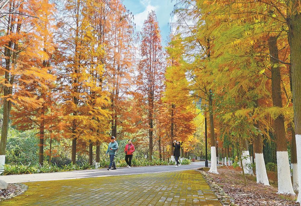 近日,在三明生态湿地公园百荷园,步行道旁的近千棵水杉退绿变红,呈现出一幅诗意景象,吸引了众多游客前来观赏、拍照。