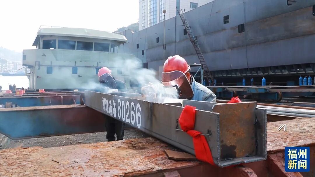 现场,电焊火花四溅,工人赶工正忙。据了解,该艘多功能智能化电动养殖辅助工船总长32米、型宽6.8米、总吨191吨,造完后将集中承担人员接驳、饲料运输、活鱼转运等核心辅助任务。