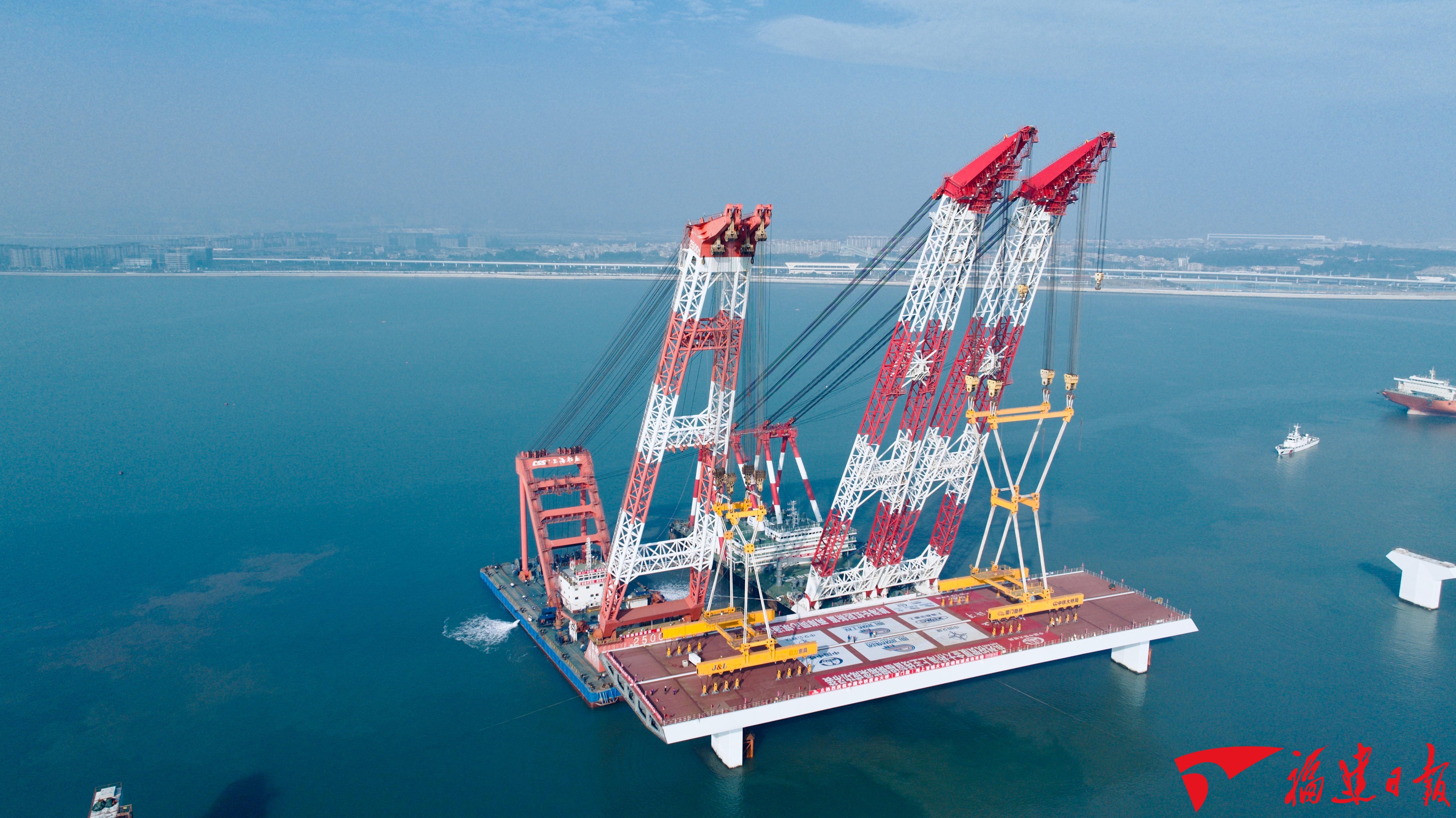 此次吊装的首榀钢箱梁由厦门路桥工程公司组织建设,中国中铁承建,中铁大桥局负责吊装,位于大嶝西航道桥东侧非通航孔桥90-91号墩,梁长142.5米、宽44米、高4.5米,总重量达4586吨,一举刷新海上装配式桥梁整孔架设钢梁的重量纪录。该项目总长约19.6公里,92榀大节段钢箱梁是支撑大桥的“钢铁脊梁”,此次成功架设为浅滩海域“智能装配化”造桥提供了重要实践样本。