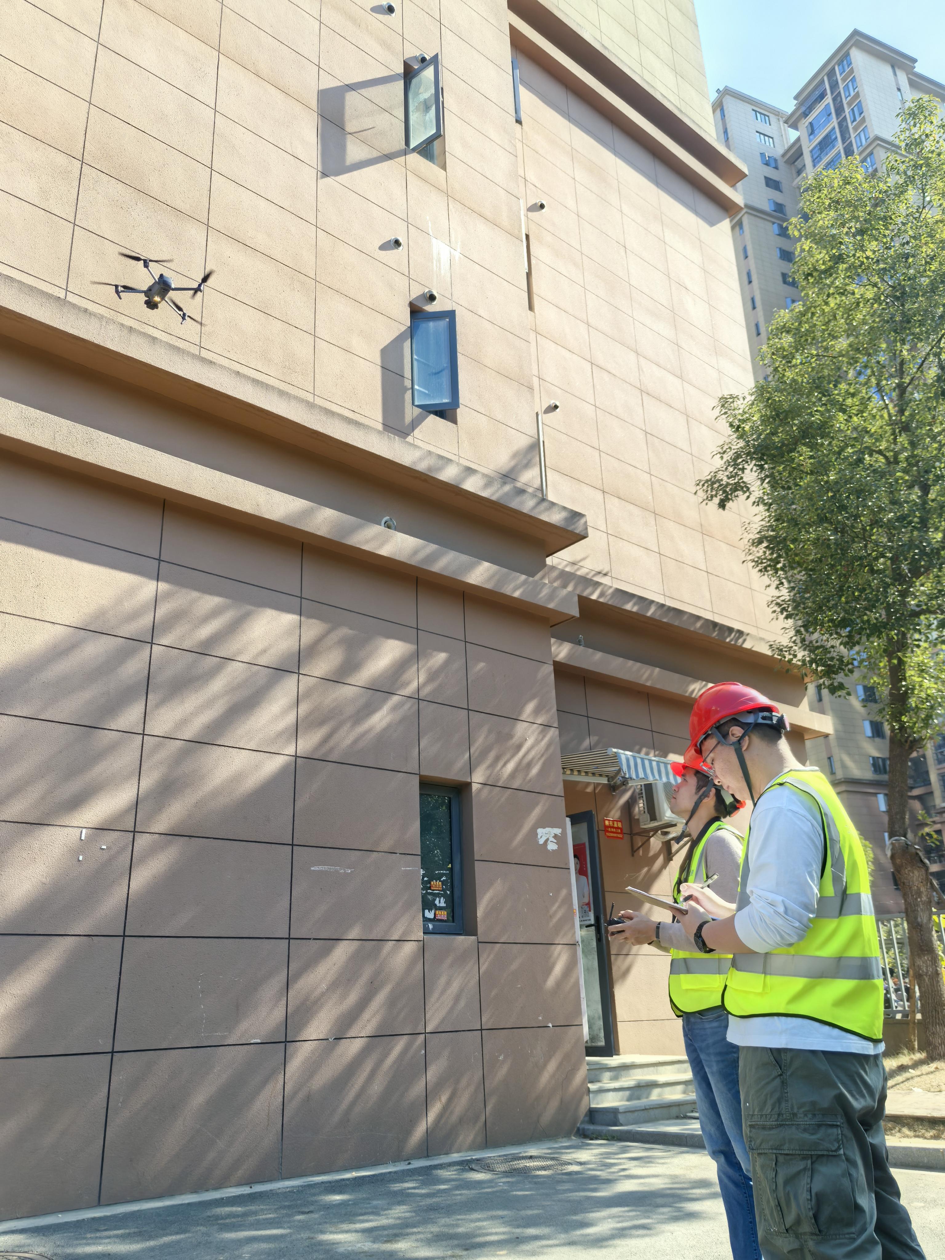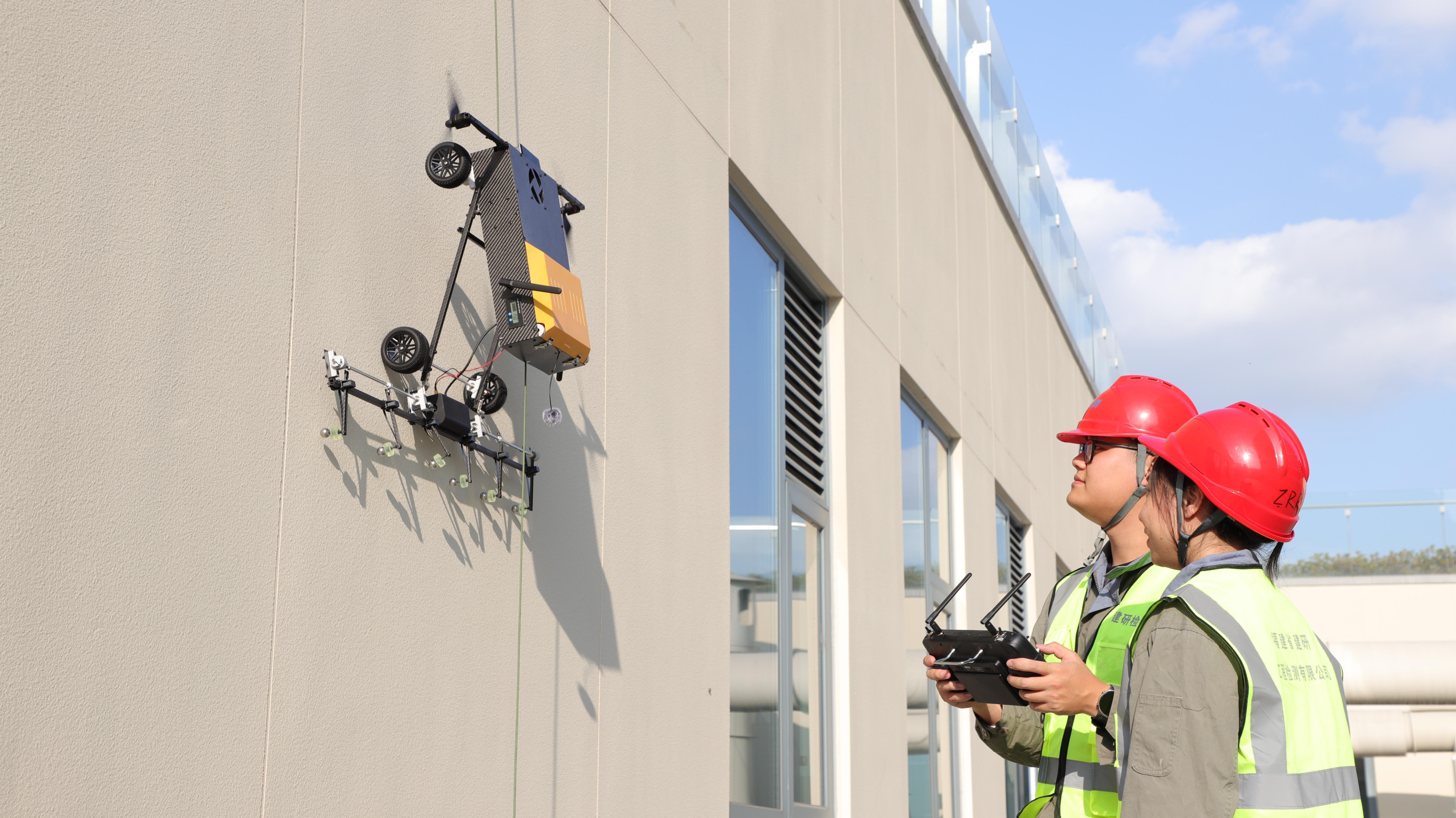省建科院房屋体检团队使用无人机和爬墙机器人对建筑外墙装饰面开裂空鼓情况作检测。温昭云 摄