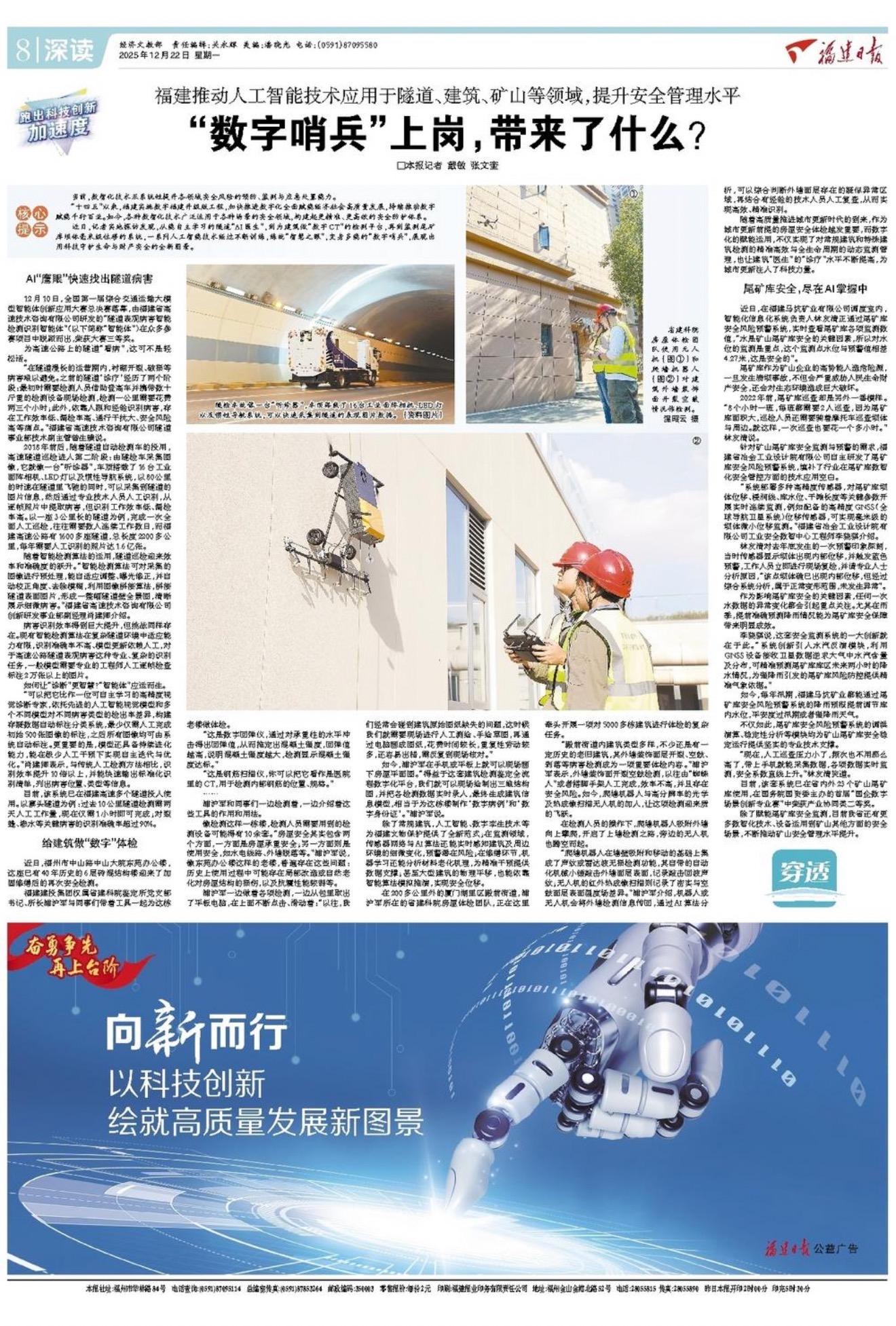近日,记者实地探访发现,从能自主学习的隧道“AI医生”,到为建筑做“数字CT”的检测平台,再到监测尾矿库坝体毫米级位移的系统,一系列人工智能技术经过不断训练,练就“智慧之眼”,变身多能的“数字哨兵”,展现出用科技守护生命与财产安全的全新图景。