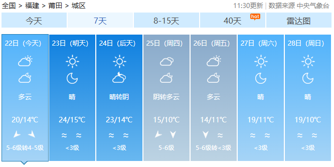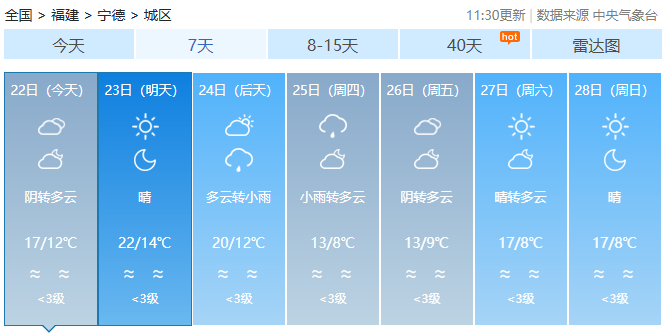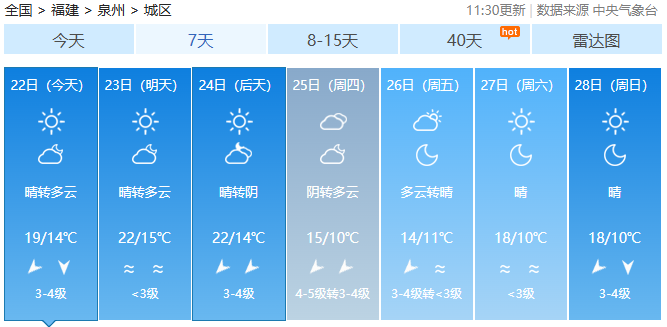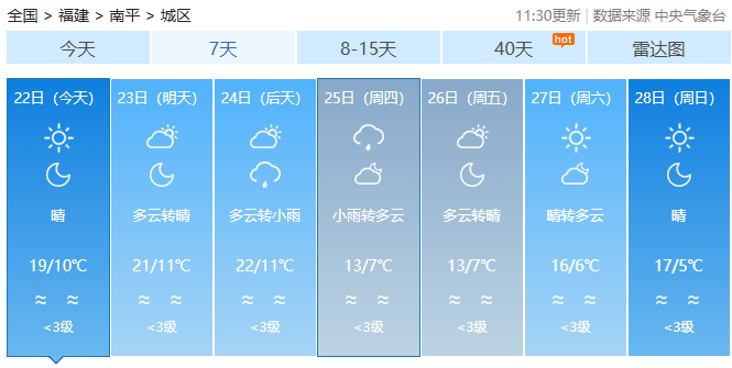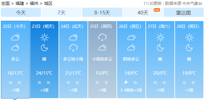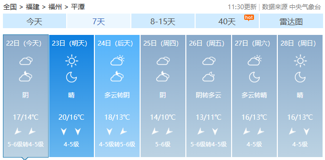 请注意防范沿海大风 对航运、滨海旅游和渔业等 带来的不利影响 未来一周天气 ↓ 福州