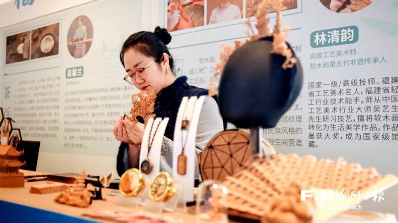 创新不止于形式,更在于内涵的延伸。林清韵与其他福州软木画年轻一代的非遗代表性传承人,从现代生活中汲取灵感,将软木画融入首饰、家居、文创等多个领域,开发出耳环、项链、胸针等饰品,以及手机壳、笔记本、书签等日常用品,为软木画这门传统艺术注入新的活力。“我们从现代生活中汲取灵感,让软木画融入人们的衣食住行。”