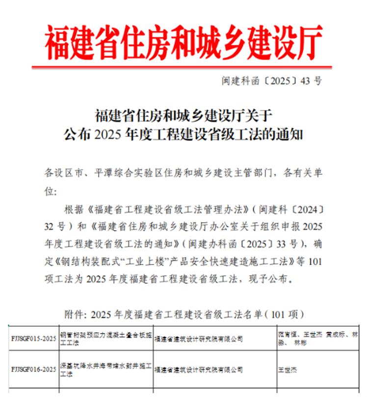 近日,福建省住房和城乡建设厅正式印发《关于公布2025年度工程建设省级工法的通知》,全省共101项工法评为2025年度福建省工程建设省级工法。其中,福建省建筑设计研究院有限公司申报的《深基坑降水井海带堵水封井施工工法》《钢管桁架预应力混凝土叠合板施工工法》全部入选,实现了公司在福建省省级工法领域 "零的突破",标志着公司在技术创新能力与工程实践水平获得行业权威认可。
