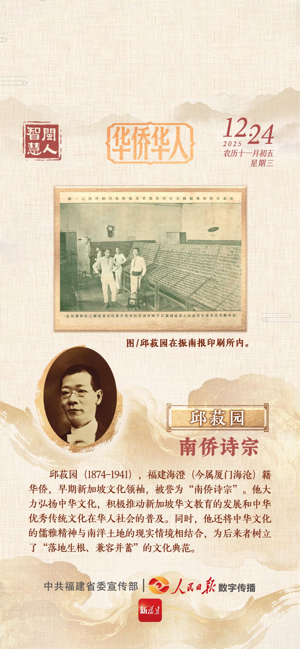 邱菽园(1874-1941),福建海澄(今属厦门海沧)籍华侨,早期新加坡文化领袖,被誉为“南侨诗宗”。他大力弘扬中华文化,积极推动新加坡华文教育的发展和中华优秀传统文化在华人社会的普及。同时,他还将中华文化的儒雅精神与南洋土地的现实情境相结合,为后来者树立了“落地生根、兼容并蓄”的文化典范。