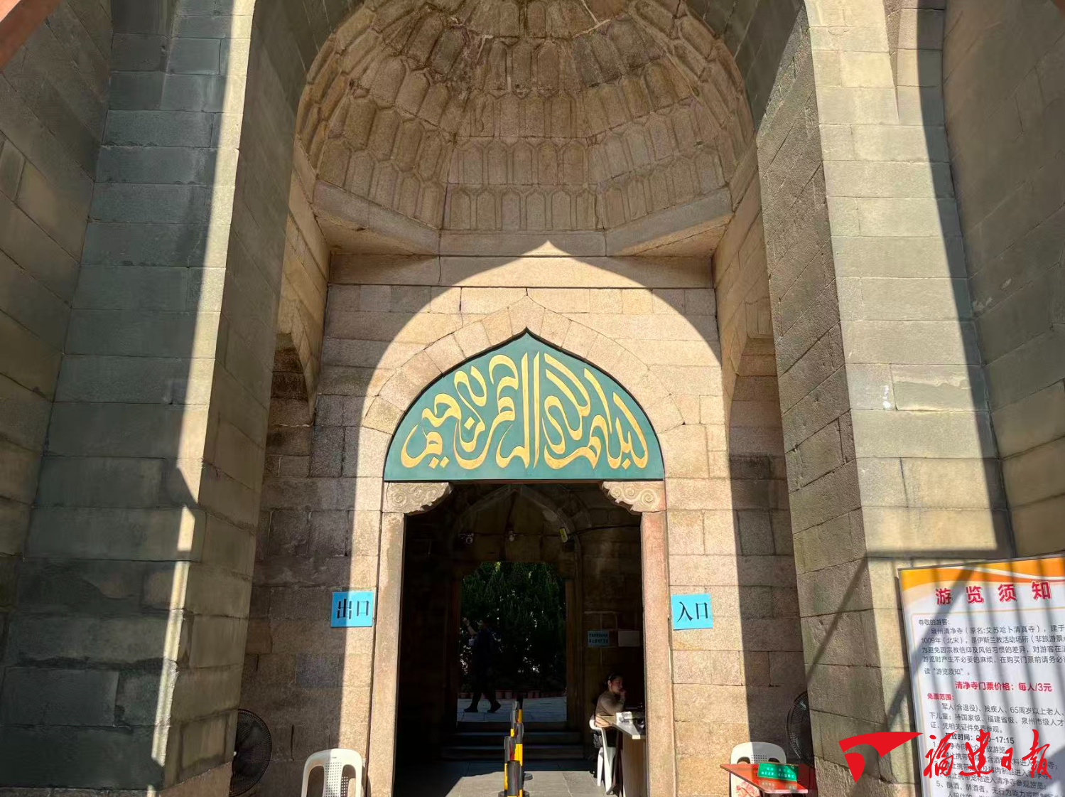 走近清净寺,映入眼帘的是高达12.3米、基座宽6.6米的门楼,由平整的花岗岩石和辉绿岩石砌筑。“清净寺的大门以青、白两色花岗石为材质,精湛地雕刻出三层穹形尖拱顶,这些拱顶设计巧妙,层层递进,呈现出一种错落有致的韵律感。而门楼的顶盖,则巧妙地融入了中国传统的莲花图案,彰显了中阿文化的相互交融与和谐共鸣。”泉州市鲤城区民宗局驻清净寺工作人员沈志勤介绍道。