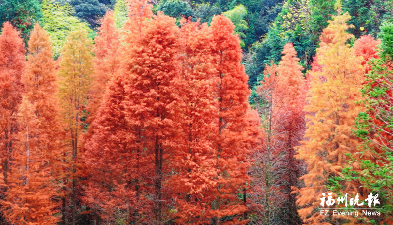 闽清古洋村的水杉林披上“红妆”。福州晚报通讯员 刘晗嫣 毛行东 摄