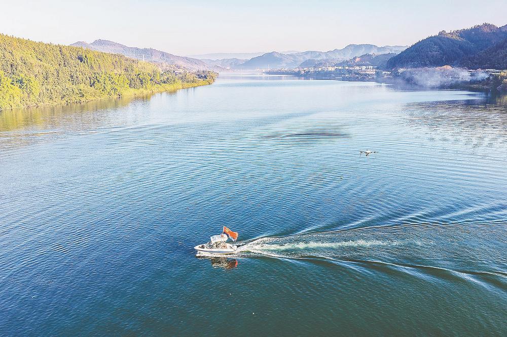 近日,顺昌县公安局“生态110”民警、蓝天救援队志愿者采取“无人机+摩托艇”的方式,加强富屯溪流域生态保护巡查。 王旺旺 摄