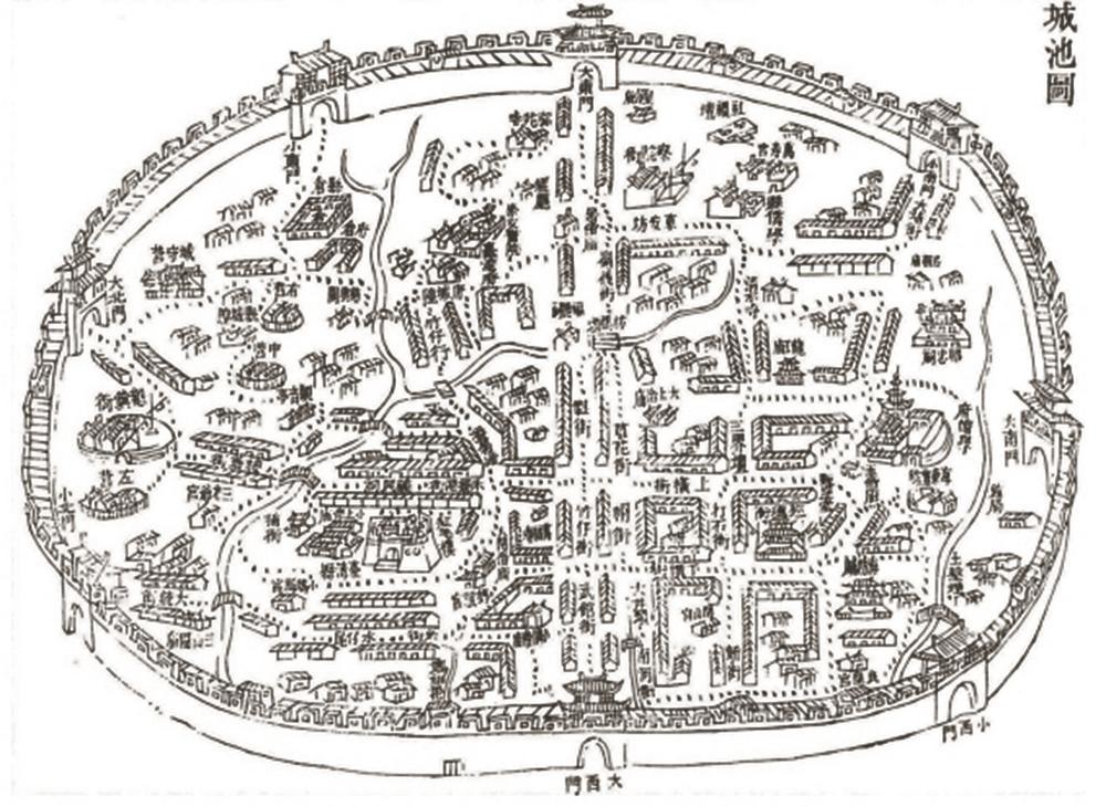 清嘉庆十二年(1807年)《台湾县志·城池图》风格与前两幅截然不同,绘制者更为强调对城市内部格局的呈现。城中建筑密布,秩序井然。从城池图上可以清晰地看到台湾府城东西向城市中轴线,西达大西门,东至大东门;南北轴线则略有偏转,自大北门向南与东西大街垂直相交,再转向小南门。东西大街和南北大街两侧林立着长条状建筑,与现代城市中的商业街形态相近。城中的重要建筑则采用了近轴测图的绘制方法,表现了院落的大小、屋顶形制、建筑高度等细节,官署建筑和宗庙建筑还加以文字标注,进一步凸显城市等级秩序。