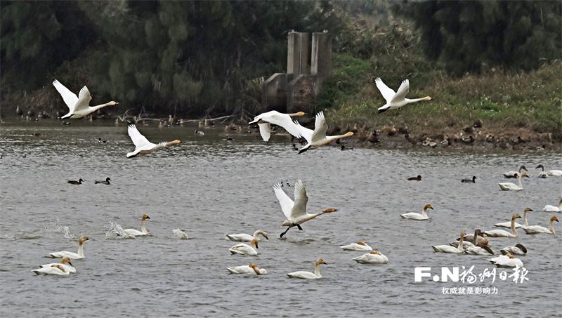 天鹅在闽江河口湿地起舞。福州日报记者 郑帅摄