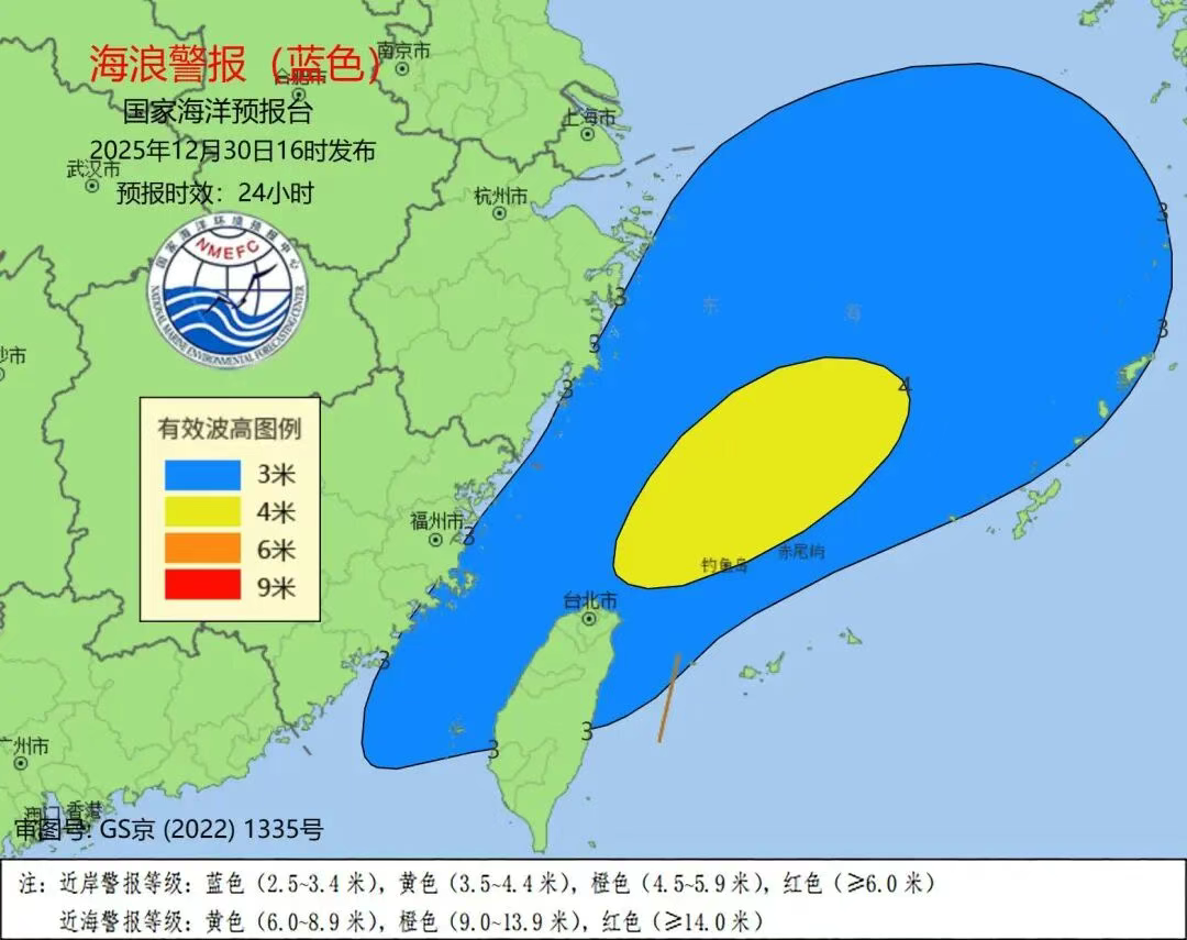 受东海低压和冷空气的共同影响,预计12月31日上午到下午,东海南部、台湾海峡将出现2.5到4米的大浪到巨浪区;浙江、福建近岸海域将出现2到3米的中浪到大浪,近岸海域海浪预警级别为蓝色。