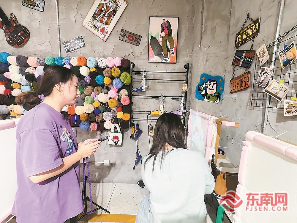 距离五缘湾10公里外的禹悦汇商场,“哦哇服饰DIY艺术研究所”在工作日下午渐渐热闹起来。店内的墙上挂满手绘T恤、贴布帆布包、缀着金属链的毛线帽,各类零碎的贴布、装饰贴画分门别类,在店内罗列成规整的坐标格。毕业于服装设计专业的店主田玲珑正弯腰指导客人如何在Tufting地毯上用马克笔描出图案的边。