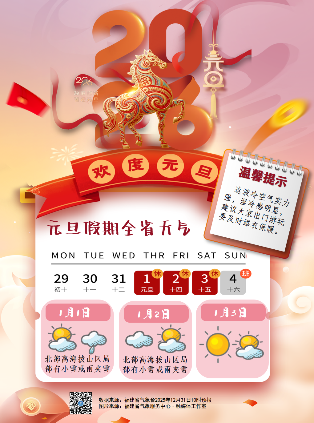 值得注意的是 元旦假期湿冷感明显 建议大家出门游玩要及时添衣保暖 1日至2日全省最低气温下滑明显 北部地区最低气温将降至冰点 高海拔山区局部还会出现小雪或雨夹雪