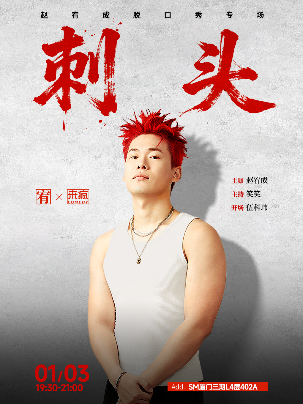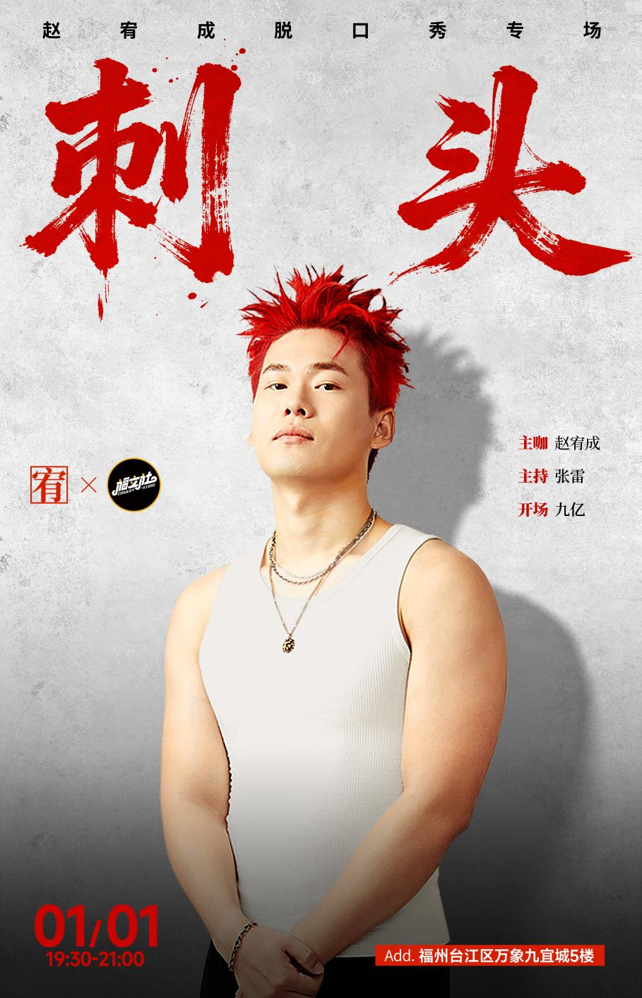 《刺头》赵宥成单口喜剧专场 时间:1月3日 19:30 地点:SM厦门三期L4层402A-来疯喜剧 票价:120元/150元 购票渠道:来疯喜剧小程序、抖音、大麦、猫眼
