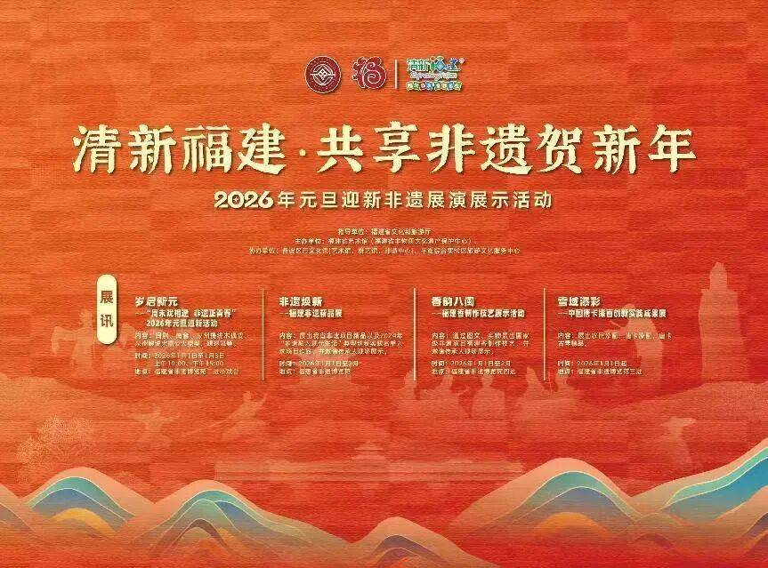 “清新福建·共享非遗贺新年”——2026元旦迎新非遗展演展示活动 时间:1月1日-2月中旬 地点: 市县动态 “福聚晋安 三十而立”晋安区非遗艺术展 时间:1月1日-1月31日 地点:
