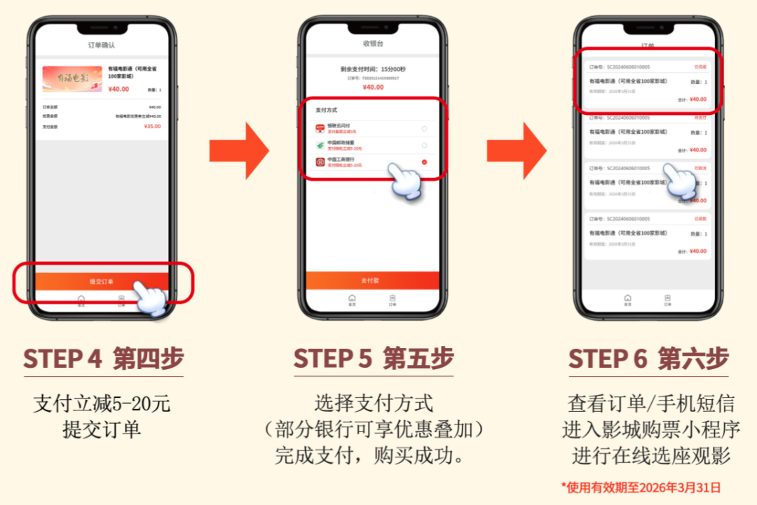 STEP6 第六步: 查看订单/手机短信,进入影城购票小程序,进行在线选座观影