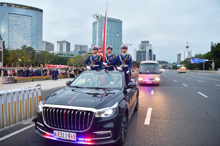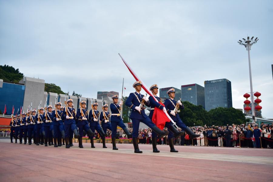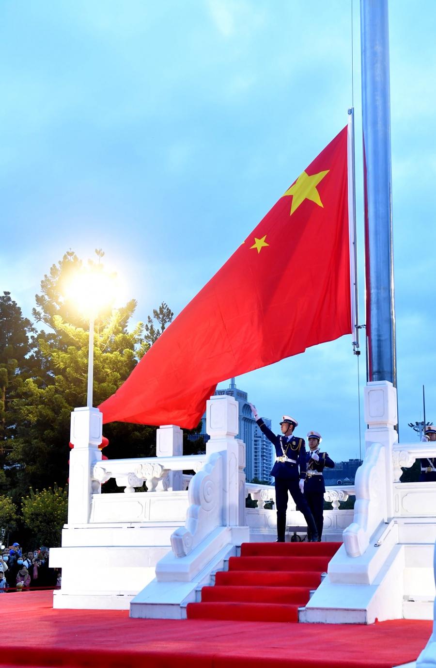 6时45分,随着清脆的指令声响起,福州五一广场国旗护卫队的40名队员身着笔挺的“火焰蓝”礼服,迈着铿锵有力的步伐,护送着鲜艳的五星红旗缓缓走向旗台。他们身姿挺拔、精神抖擞,步伐整齐划一。
