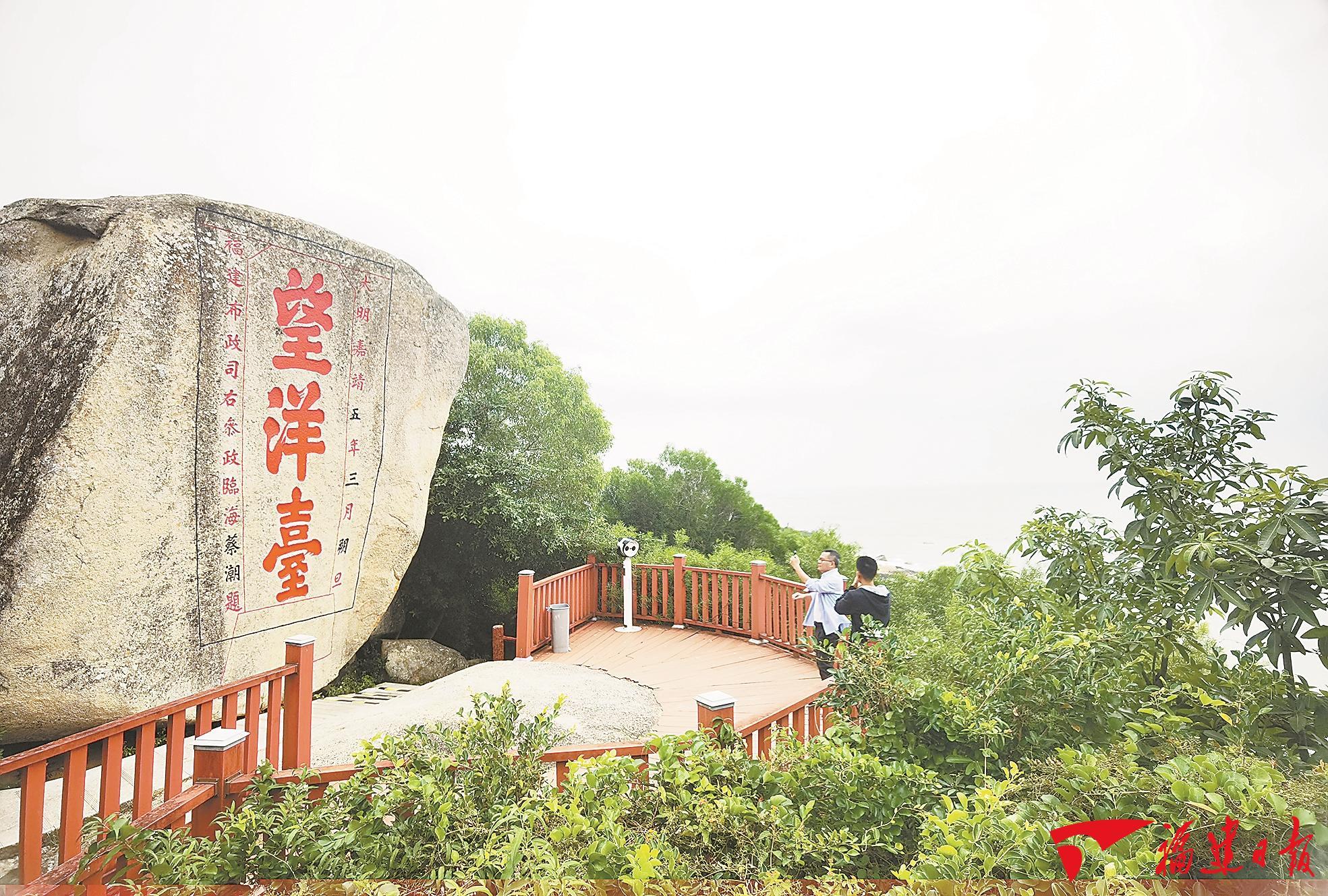 冬日暖阳中,登上望洋台,海风迎面,远眺水天相接,一片安宁辽阔。明嘉靖五年(1526年),福建布政司右参政蔡潮(1467—1549年)题刻于巨石之上的“望洋台”三字,每个字高达1.5米,笔力千钧,气势磅礴。其还写下《倚石望洋》一诗:“极目茫茫天作维,浪花拍浪鸣春雷。藐汉鹍鹏起云翼,轻鸿犍鹄惊飞回。顿遣尘襟开遏塞,到此真应笑河伯。便欲垂竿连六鳌,未辨丝纶空叹息!”