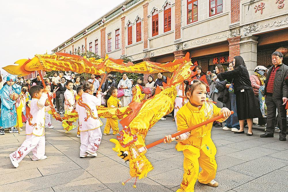 2025年12月31日,“漫步古城探乡趣 亲子徒步迎新年”活动在泉州市中山路举行,萌娃表演舞龙,吸引众多市民游客驻足观看。林升 摄