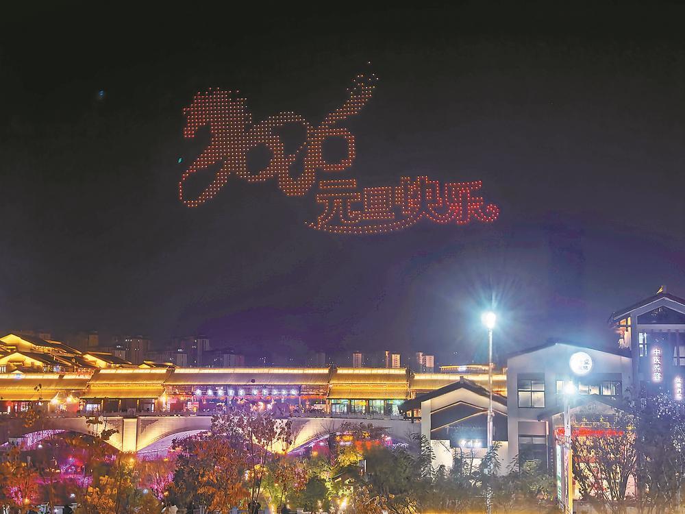 2025年12月31日,南平市武夷水城的夜空,千架无人机展示“2026元旦快乐”灯光秀。黄杰敏 摄