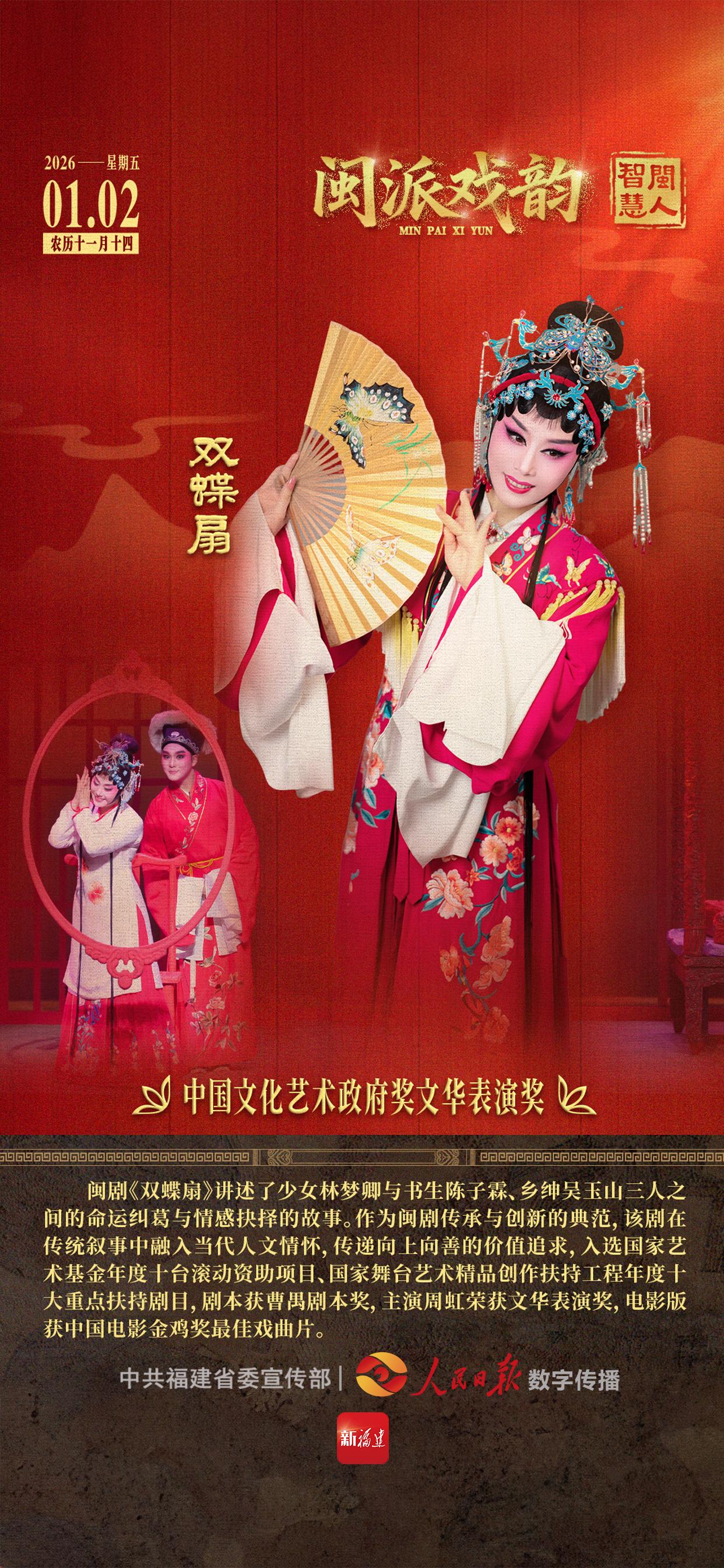 闽剧《双蝶扇》讲述了少女林梦卿与书生陈子霖、乡绅吴玉山三人之间的命运纠葛与情感抉择的故事。作为闽剧传承与创新的典范,该剧在传统叙事中融入当代人文情怀,传递向上向善的价值追求,⼊选国家艺术基⾦年度⼗台滚动资助项⽬、国家舞台艺术精品创作扶持⼯程年度⼗⼤重点扶持剧⽬,剧本获曹禺剧本奖,主演周虹荣获文华表演奖,电影版获中国电影⾦鸡奖最佳戏曲⽚。