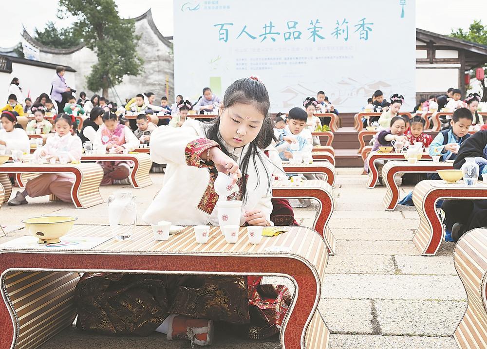 1日,福州梁厝特色历史文化街区,学生与家长在体验茶艺。福建日报记者 游庆辉 摄