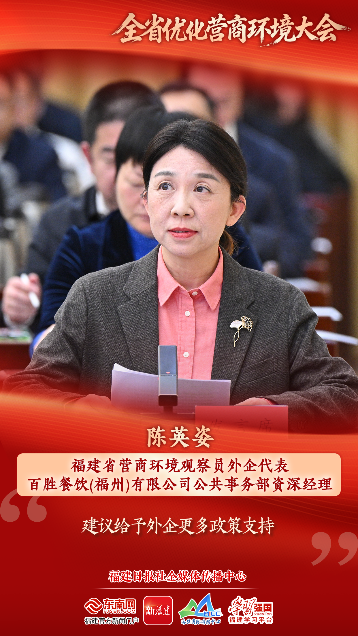 近年来,福建在优化营商环境方面成效明显。大家普遍反映,近几年福建的政务服务更加高效,政策支持更加精准,法治保障更加到位,融资渠道更加便捷,成本明显降低,增强了民企发展的信心。营商环境没有最好,只有更好。建议持续凝聚优化营商环境的思想共识,全方位加大宣传力度,引导社会各界,奏响“营商环境,从我做起”的时代强音,让一流营商环境成为福建高质量发展的金字招牌;紧紧扭住优化营商环境的重点难点,聚焦“市场化、法治化、国际化”持续用力,久久为功,让福建成为近悦远来的营商沃土。