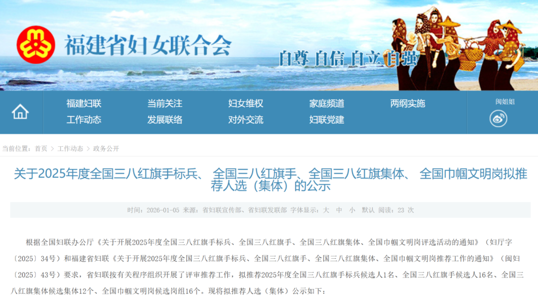 1月5日 福建省妇女联合会发布公示 拟推荐2025年度 全国三八红旗手标兵候选人1名 全国三八红旗手候选人16名 全国三八红旗集体候选集体12个 全国巾帼文明岗候选岗组16个 公示时间为 2026年1月5日至1月9日 来看具体名单——