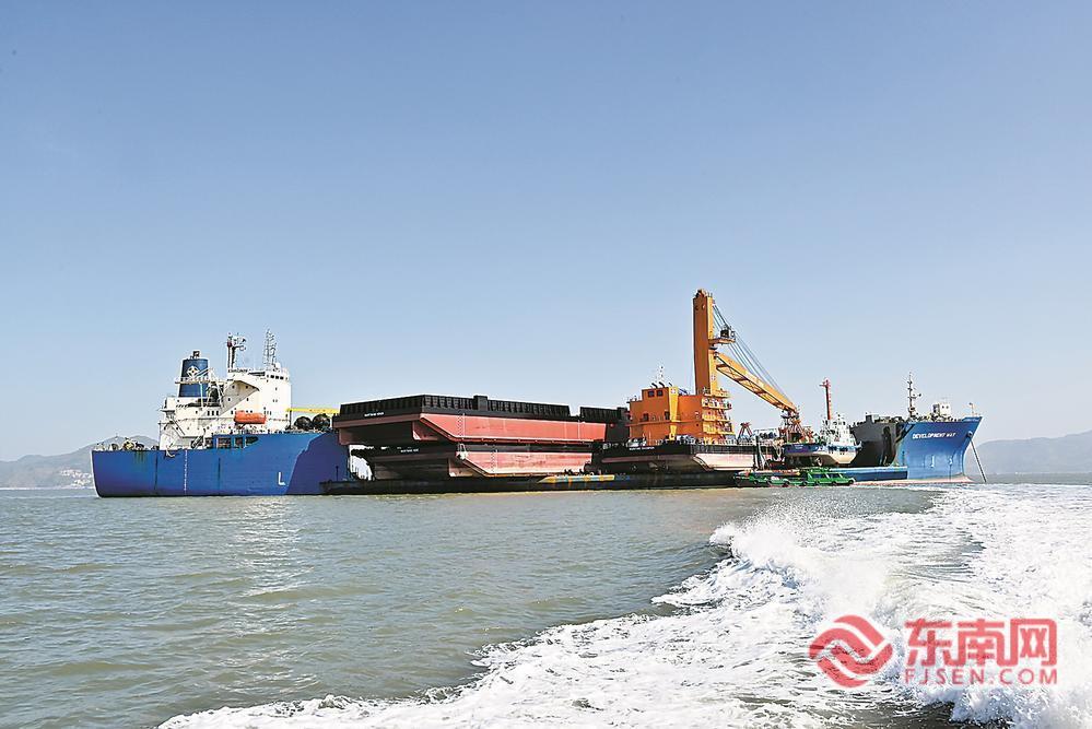 大型半潜船“发展之路”轮在宁德港装载5艘船舶出口几内亚