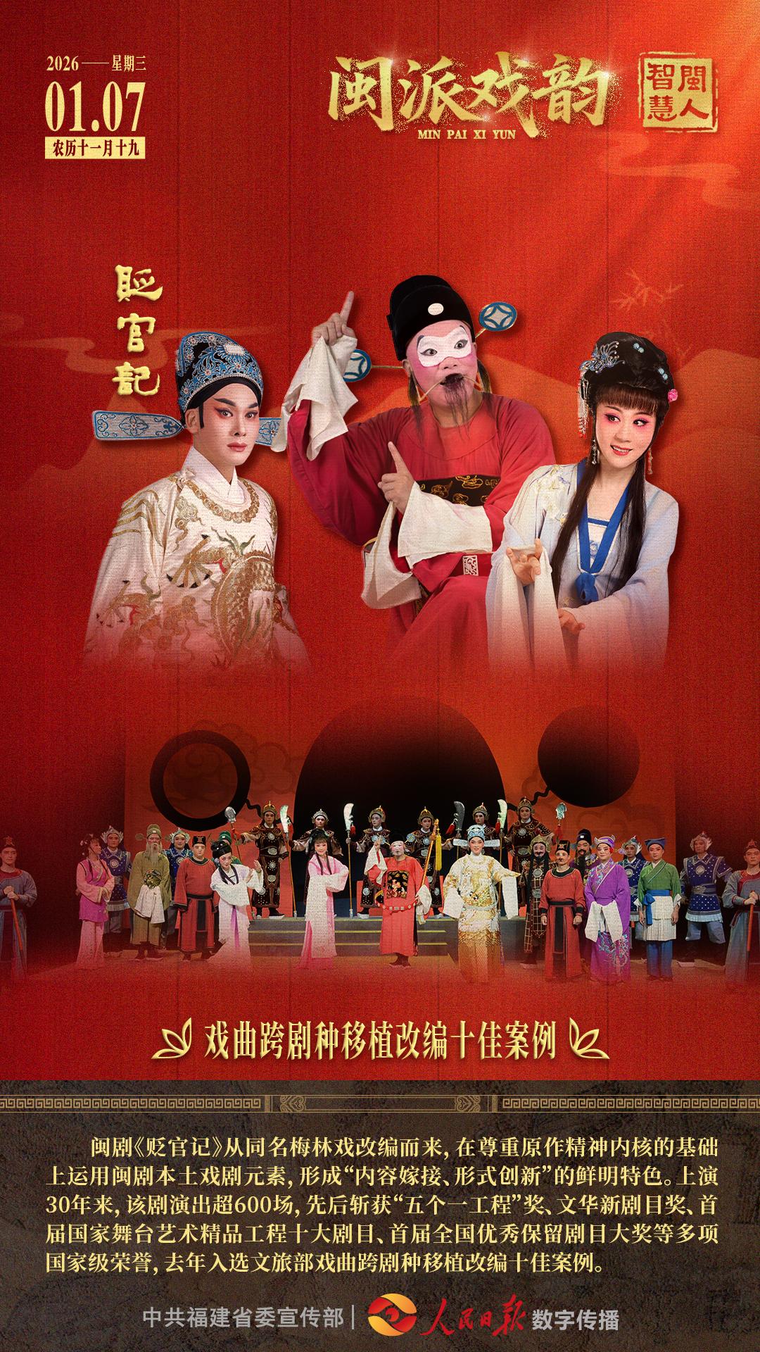 闽剧《贬官记》从同名梅林戏改编而来,在尊重原作精神内核的基础上运用闽剧本土戏剧元素,形成“内容嫁接、形式创新”的鲜明特色。上演30年来,该剧演出超600场,先后斩获“五个一工程”奖、文华新剧目奖、首届国家舞台艺术精品工程十大剧目、首届全国优秀保留剧目大奖等多项国家级荣誉,去年入选文旅部戏曲跨剧种移植改编十佳案例。