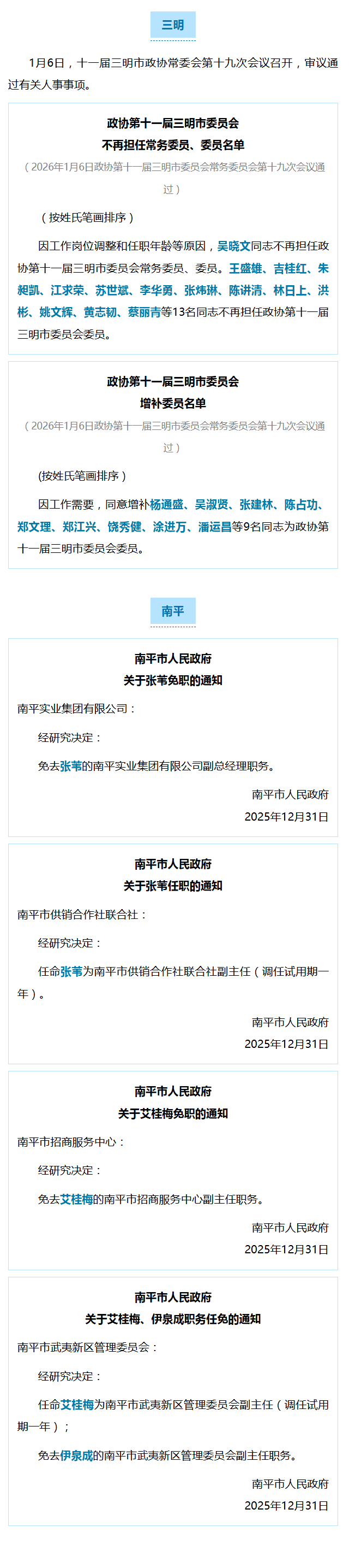 三明、南平发布一批人事消息