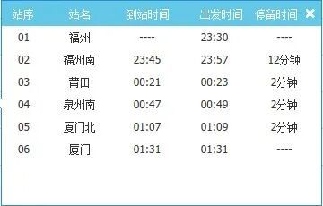 G9809次列车将于1月11日23时30分从福州站始发,23时45分到达福州南站、23时57分福州南站开车;沿途0时21分经停莆田站、0时47分经停泉州南站、1时07分经停厦门北站、1时31分终到厦门站。