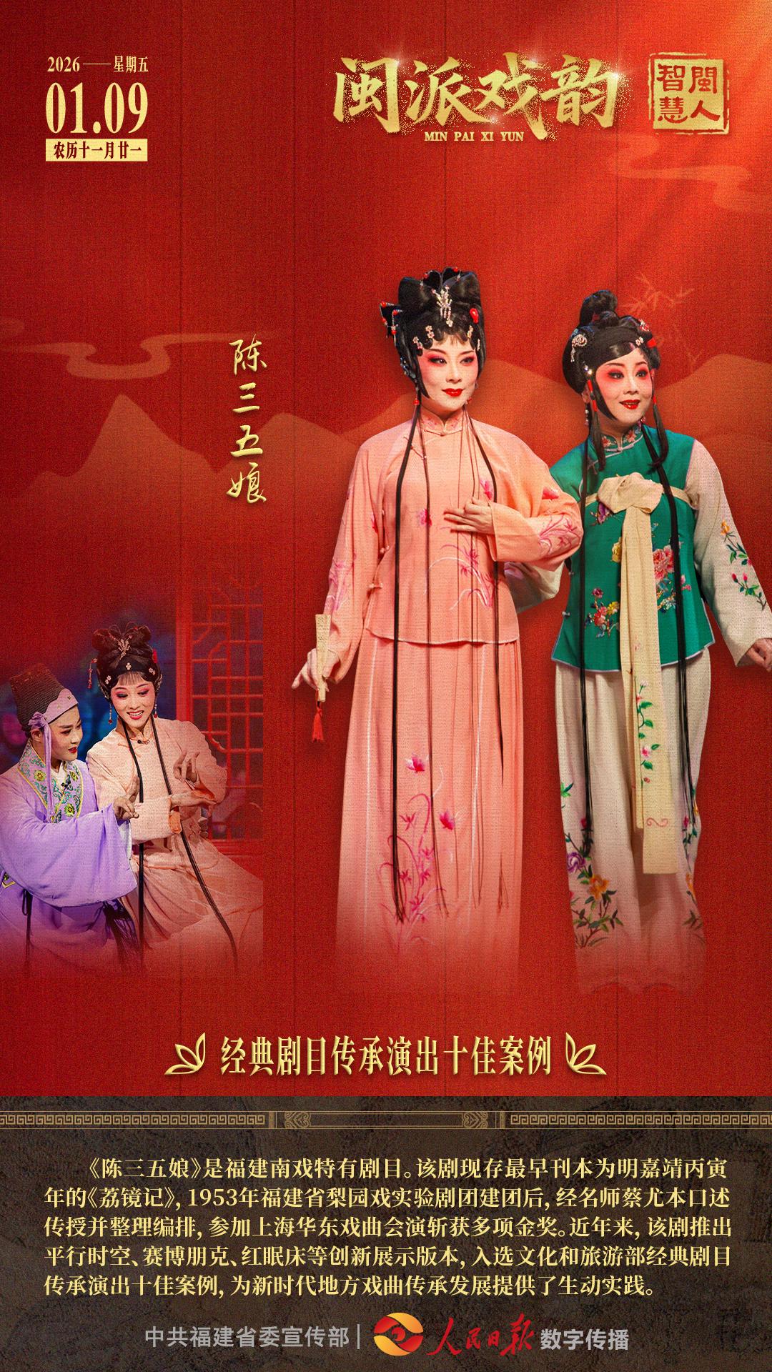 《陈三五娘》是福建南戏特有剧目。该剧现存最早刊本为明嘉靖丙寅年的《荔镜记》,1953年福建省梨园戏实验剧团建团后,经名师蔡尤本口述传授并整理编排,参加上海华东戏曲会演斩获多项金奖。近年来,该剧推出平行时空、赛博朋克、红眠床等创新展示版本,入选文化和旅游部经典剧目传承演出十佳案例,为新时代地方戏曲传承发展提供了生动实践。