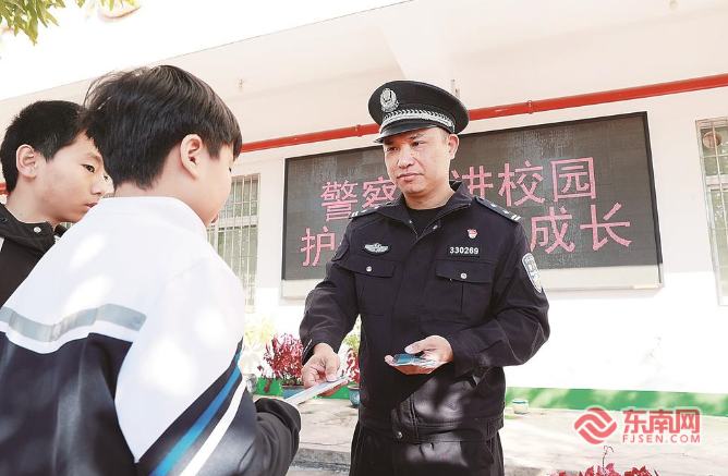 8日,漳州市公安局龙海分局治安大队组织警员开展庆祝第六个中国人民警察节暨进校园护佑青春伴成长活动,宣传校园防霸凌相关知识。 黄飞鸿 摄