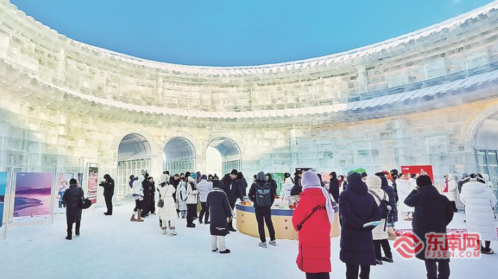 阳光透过晶莹的冰砖,在土楼内折射出五彩的光影。“浪花慕雪白 乐享福年来”福建文旅主题图片展在冰雕土楼内外同步拉开帷幕,围绕“交换冬天”理念,精选呈现我省九市一区温暖如春的冬季风光与人文景观,与北国冰雪形成“山海与冰雪”的诗意对话,直观传递“来福建,享福年”的盛情邀请。