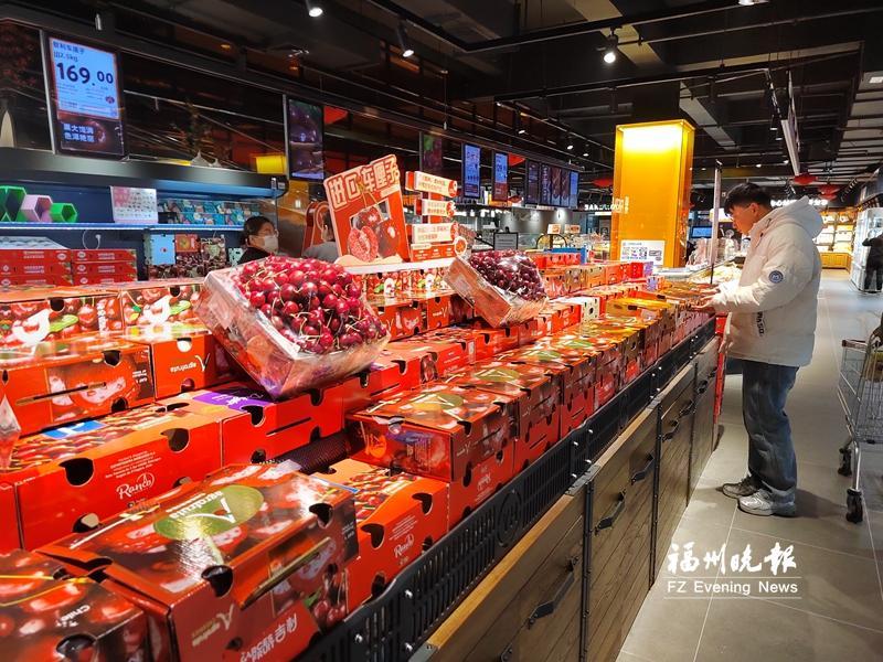 福州的超市里,货架上摆着许多车厘子礼盒。