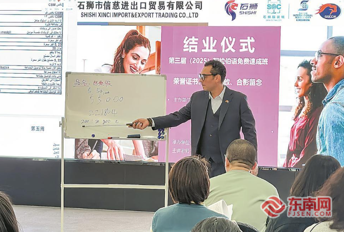 “亨利老师教的内容特别实用,跟阿拉伯国家客户交流时更有亲和力。”石狮服装城的商户潘婷几乎每堂课都准时到场,本子上是密密麻麻的笔记。即便业务再忙,亨利仍坚持每个工作日抽出一个半小时授课。他的讲课气氛轻松活泼,他还特意叮嘱学员“有急事可以随时离开、随时返回”。迄今,这项公益培训已举办三届,为当地企业与中东客商搭建起坚实的语言桥梁。