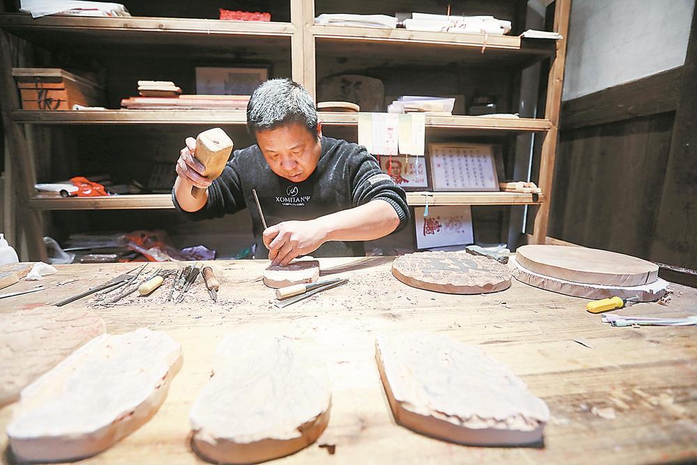 非遗代表性传承人马力在精心雕刻雕版。
