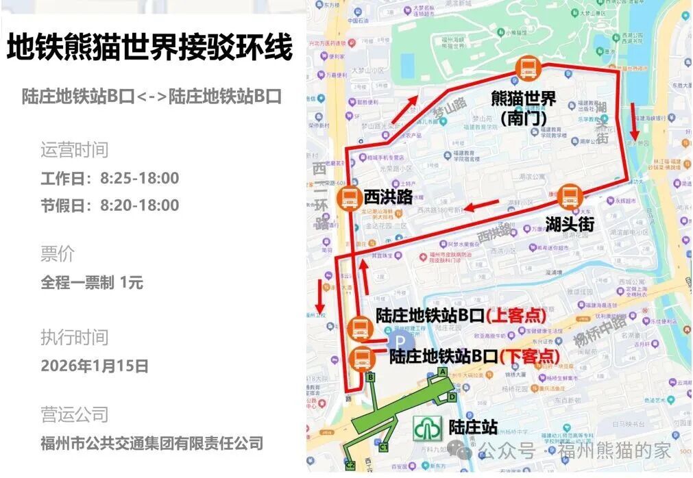 熊猫家咋走? 一份带着竹叶清香的出行指南 公共交通,最推荐的方式 ⬇️ 地铁出行:乘坐地铁4号线至陆庄站 一、出站后可选以下方式: 1.地铁熊猫世界接驳环线:陆庄站B出口处步行50米乘坐地铁熊猫世界接驳环线,直达福州熊猫世界南门。 停靠站点:陆庄地铁站B口、西洪路、熊猫世界(南门)、湖头街。 营运时间:工作日8:25-18:00、节假日8:20-18:00。 2.公交换乘:从A出口出站,步行至陆庄公交站,换乘301路公交车,乘坐3站至熊猫世界站,下车即达园区北门。