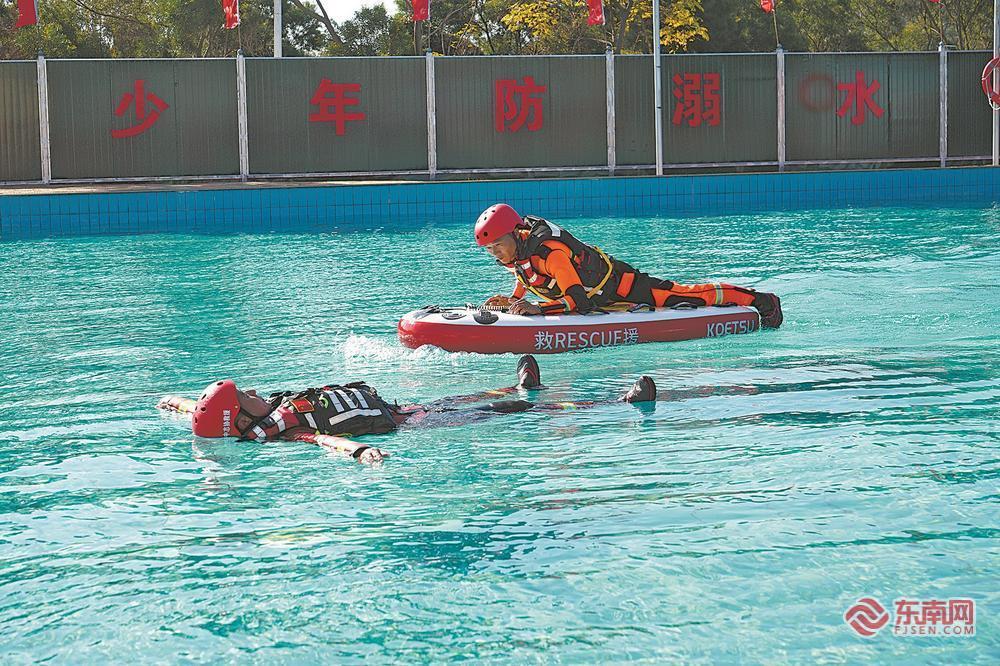 1月14日,泉州市泉港区举行青少年防溺水文明实践公益课堂。图为在后龙镇,救援队员进行桨板救援演示。福建日报通讯员 洪坤泽 摄