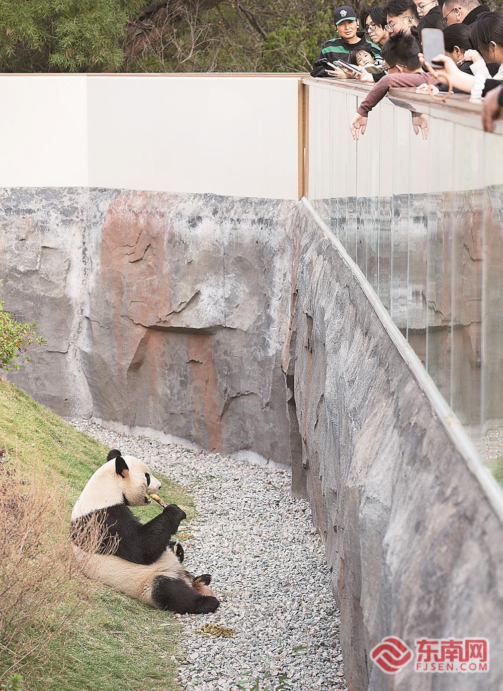 游客围观熊猫“启航”吃竹子。林晓烨 摄