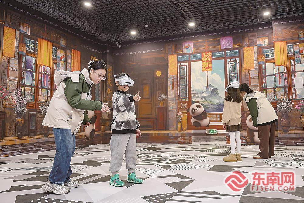 青少年体验熊猫主题XR大空间全交互虚拟电影《山神熊猫》。福建日报记者 施辰静 摄