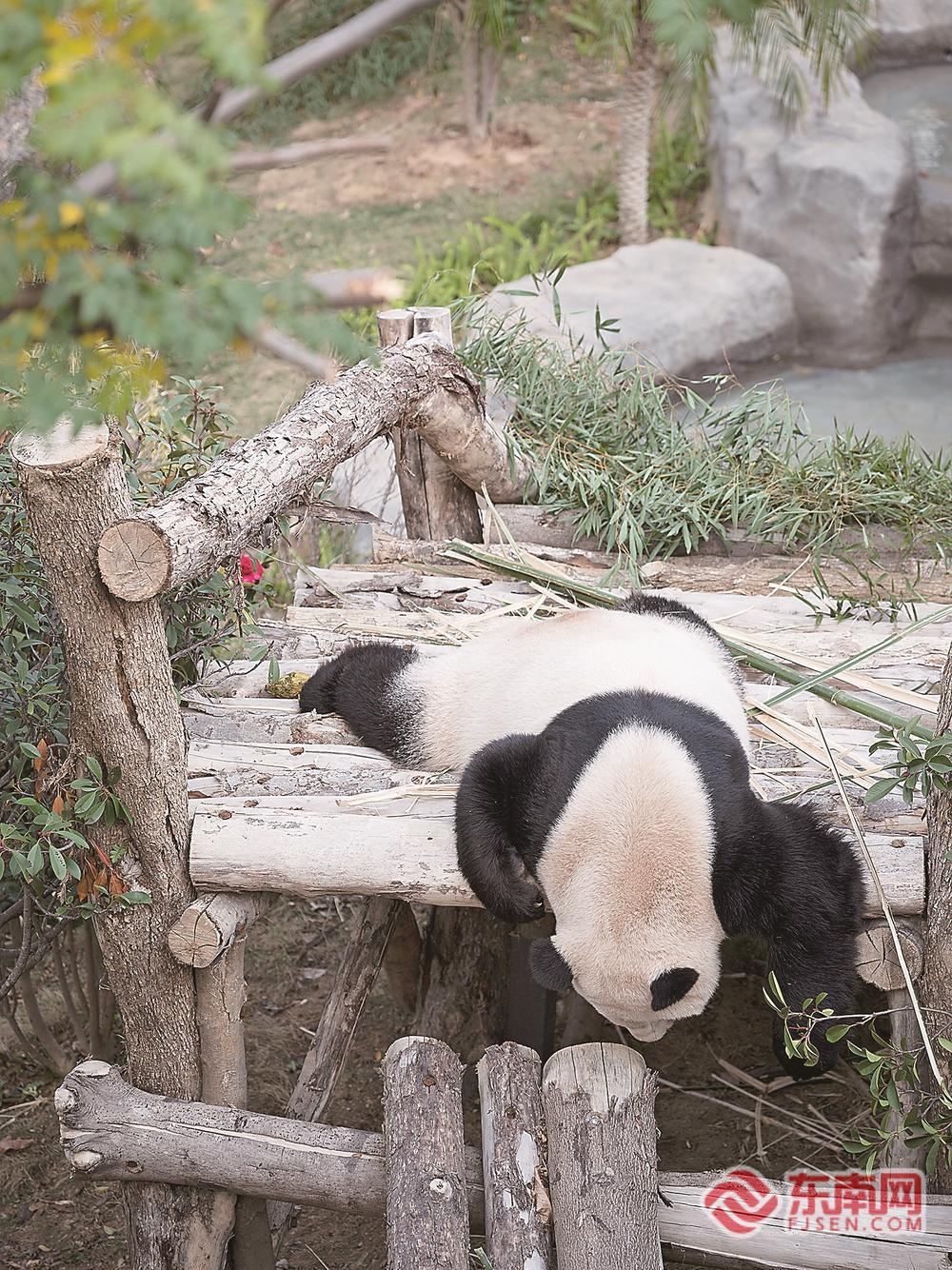 隔壁院子住着“启程”的双胞胎弟弟“启航”。“它性格非常活泼外向,也是5只中第一个适应新家的。”讲解员郭铸慷说,“启航”在成都大熊猫基地时就是“迎宾熊猫”。为此,福州熊猫世界为它设计了同样的塔架和环境,让它负责欢迎登上大梦山顶的市民游客。记者发现,“启航”还是个“小吃货”,喜欢舒舒服服地坐着啃竹子。半米长的竹竿,三两下就被它啃完。