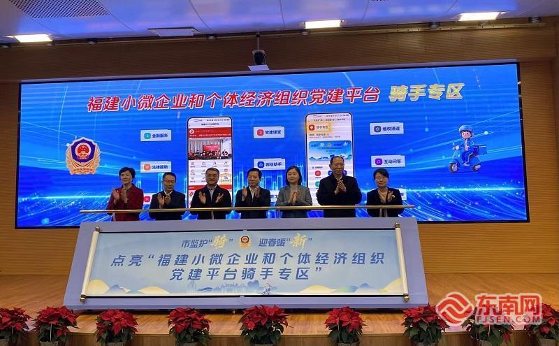 活动现场,省市场监管局、省委组织部、省委社会工作部等单位相关领导共同点亮“福建小微企业和个体经济组织党建平台‘骑手专区’”,为网约配送员群体健康发展注入强劲红色动能。