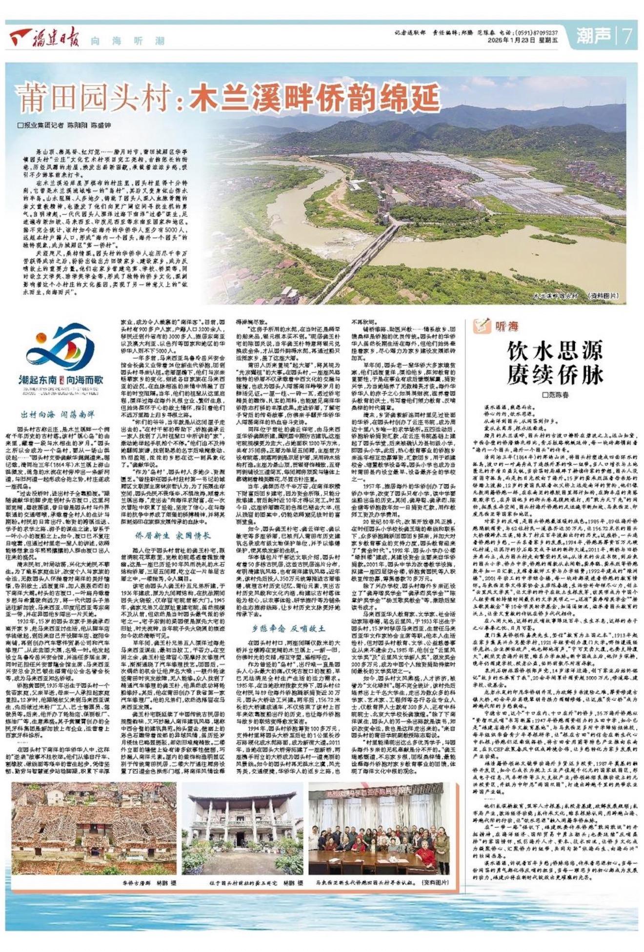 在木兰溪沿岸星罗棋布的村庄里,园头村显得十分特别,它曾是木兰溪流域唯一的“岛村”,其后又变身依山傍水的半岛。山水阻隔、人多地少,铸就了园头人深入血脉骨髓的崇文重教精神,也激发了他们向更广阔空间寻找生机的勇气。自明清起,一代代园头人漂洋过海下南洋“过番”谋生,足迹遍布新加坡、马来西亚、印度尼西亚等东南亚国家和地区。据不完全统计,该村如今在海外的华侨华人至少有5000人,远超本村户籍人口,形成“海内一个园头,海外一个园头”的独特现象,成为城厢区“第一侨村”。