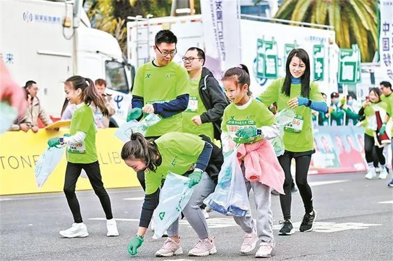 厦门马拉松赛持续多年开展“建发绿跑在行动”,以家庭为单位组织家长带领孩子捡拾赛道垃圾,传递文明理念。(厦门市委文明办 供图)