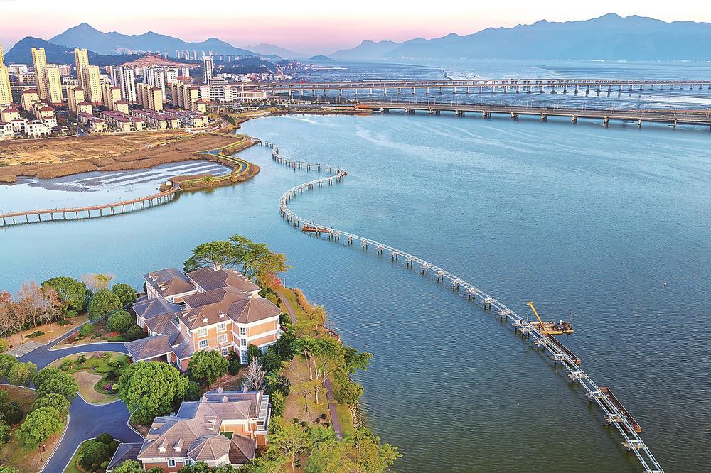 近日,在宁德市东湖北岸,一条蜿蜒在碧水间的栈道正在进行主体钢结构施工。据悉,该段栈道长约700米,是环东湖及周边景观提升工程项目的组成部分。