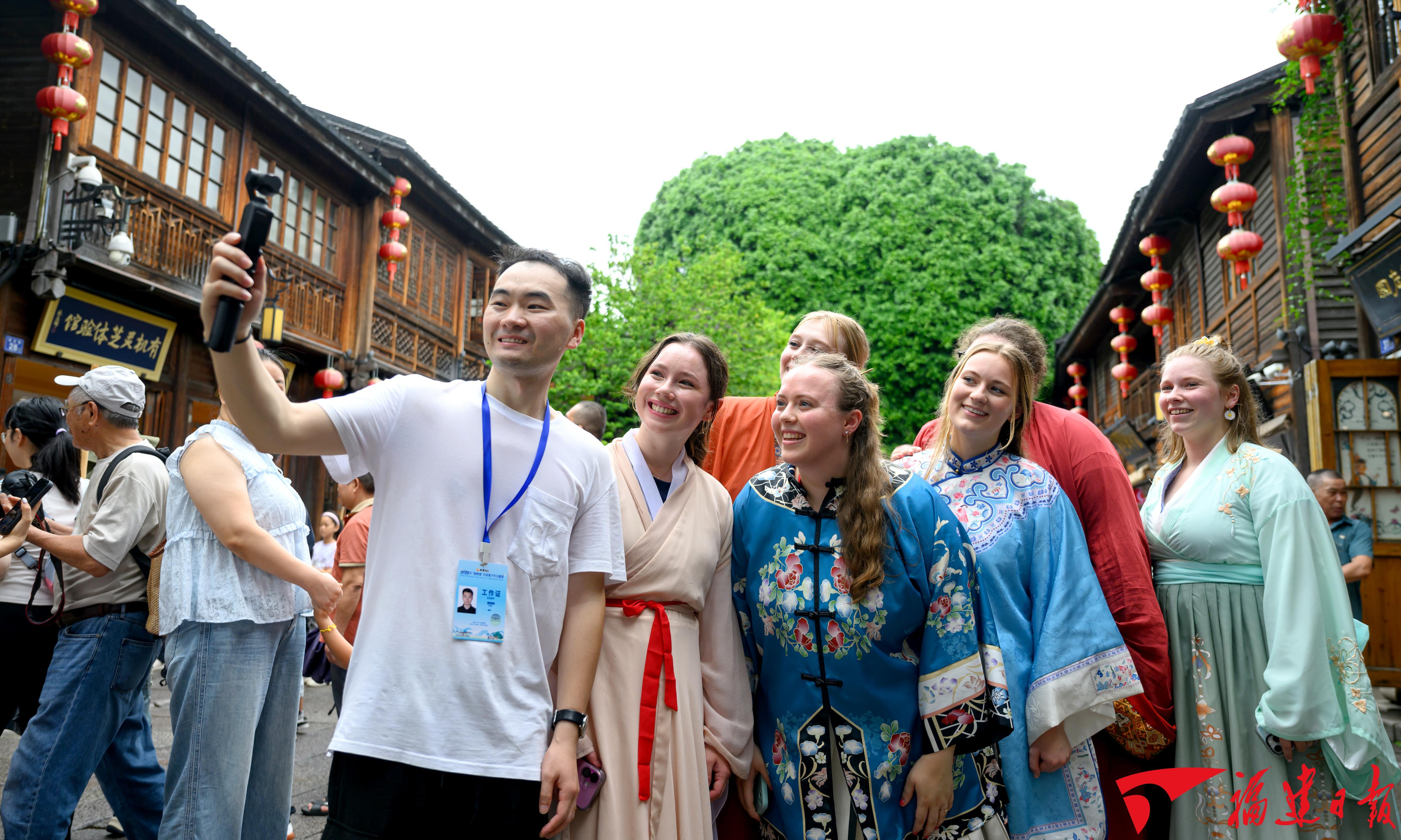 “十四五”期间,福建故事、中国声音在世界舞台精彩绽放。图为2025年7月12日,参加“鼓岭缘”中美青少年合唱周的美国青少年在三坊七巷身穿汉服留影。 施辰静 摄