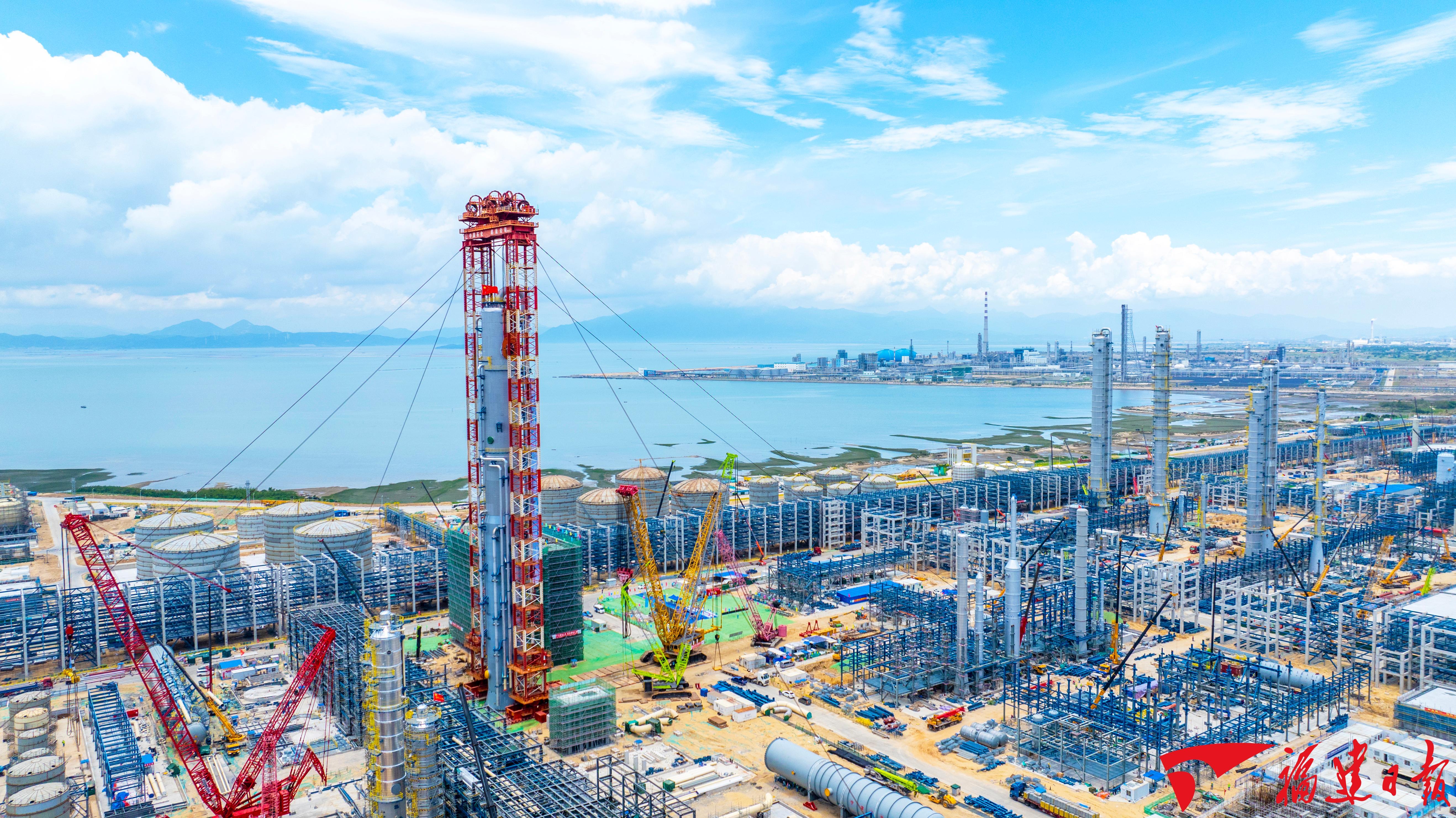 中沙古雷乙烯项目和古雷炼化一体化工程二期项目相继开工建设,先后打破福建外商投资项目和单体工业项目投资额纪录。图为2025年5月16日,全球最大EOEG洗涤塔在中沙古雷乙烯项目工地成功吊装。 沈昊鹏 摄