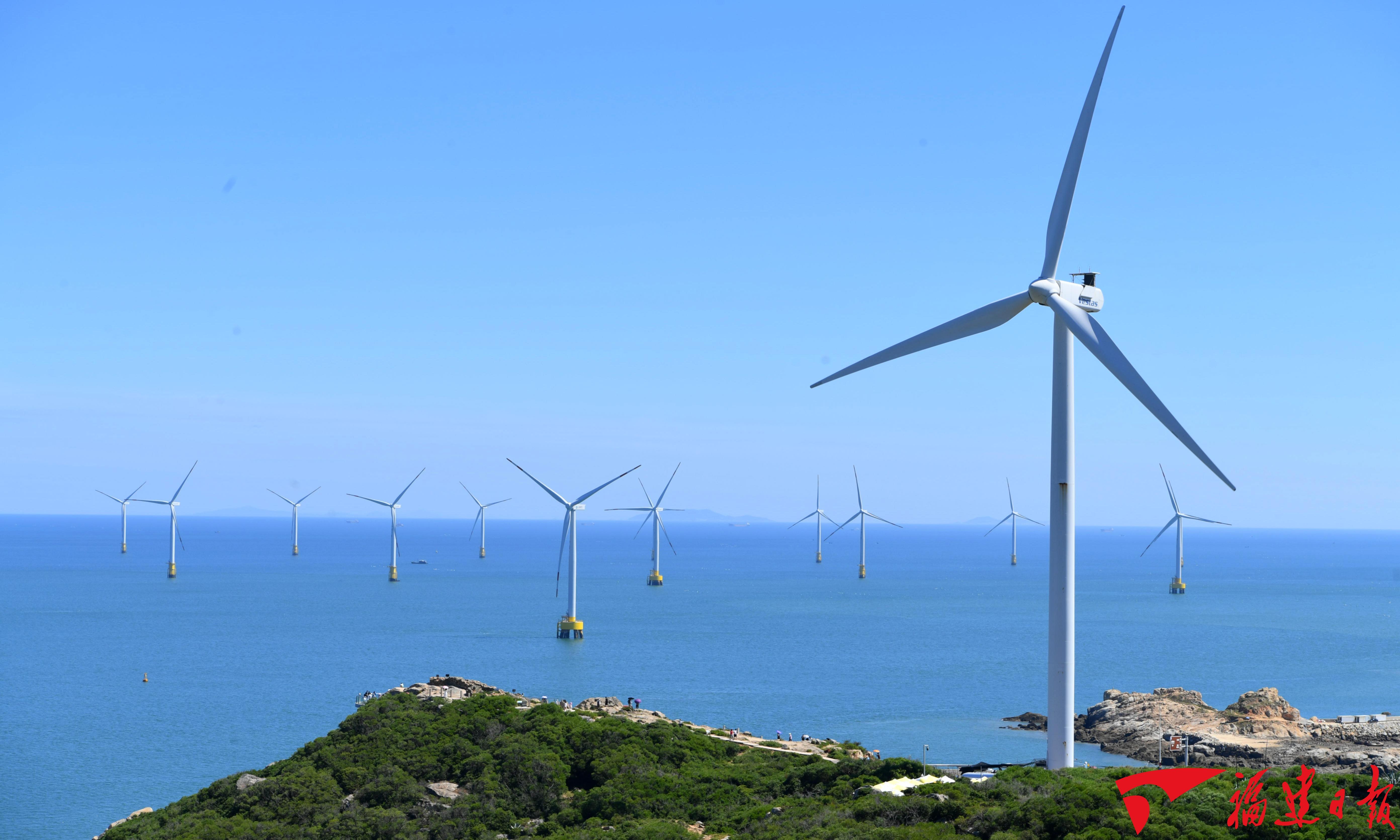 “十四五”期间,福建清洁能源装机占比超65%,领跑绿色发展。图为2022年8月19日拍摄的平潭海上风电项目。 游庆辉 摄